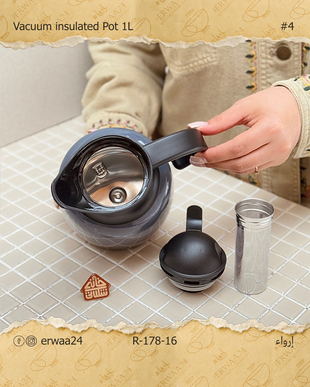 يمكن وضع الشاي أو الأعشاب المفضلة في الفلتر ووضعها في الترمس ويسكب عليه ماء مغلي أو دافئ.
